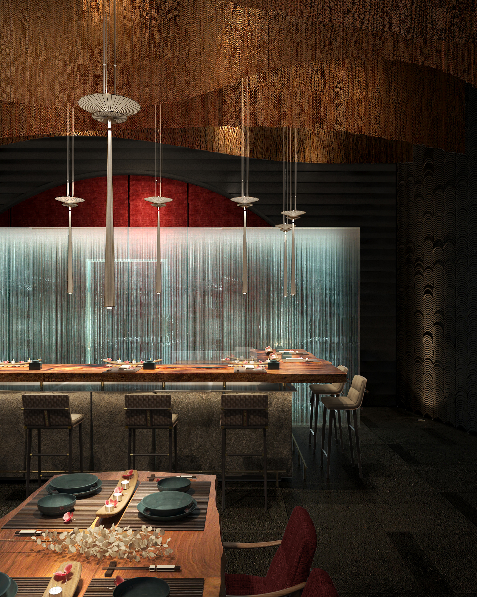 Vật liệu gỗ tự nhiên, đá và các chi tiết hoàn thiện được xử lý tinh tế nhằm tạo nên cảm giác ấm áp và tĩnh tại. Bố cục không gian được tổ chức mạch lạc, kết hợp ánh sáng dịu nhẹ để dẫn dắt trải nghiệm ẩm thực. Mỗi chi tiết đều được kiểm soát nhằm đảm bảo sự hài hòa giữa thẩm mỹ, công năng và bản sắc văn hóa.